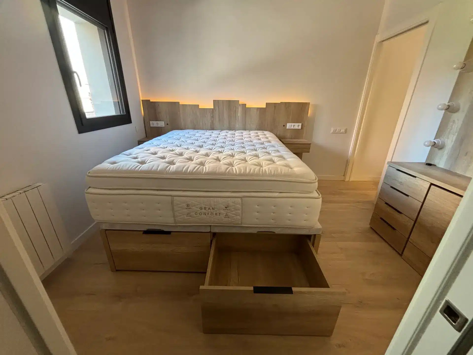 Y si te gusta estar a la última… Añádele luces leds al cabezal o al armario; toma de usb o incluso cargadores inalámbricos para las mesitas de noche.