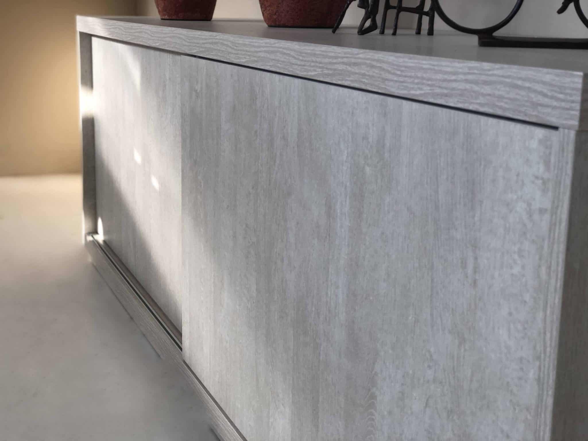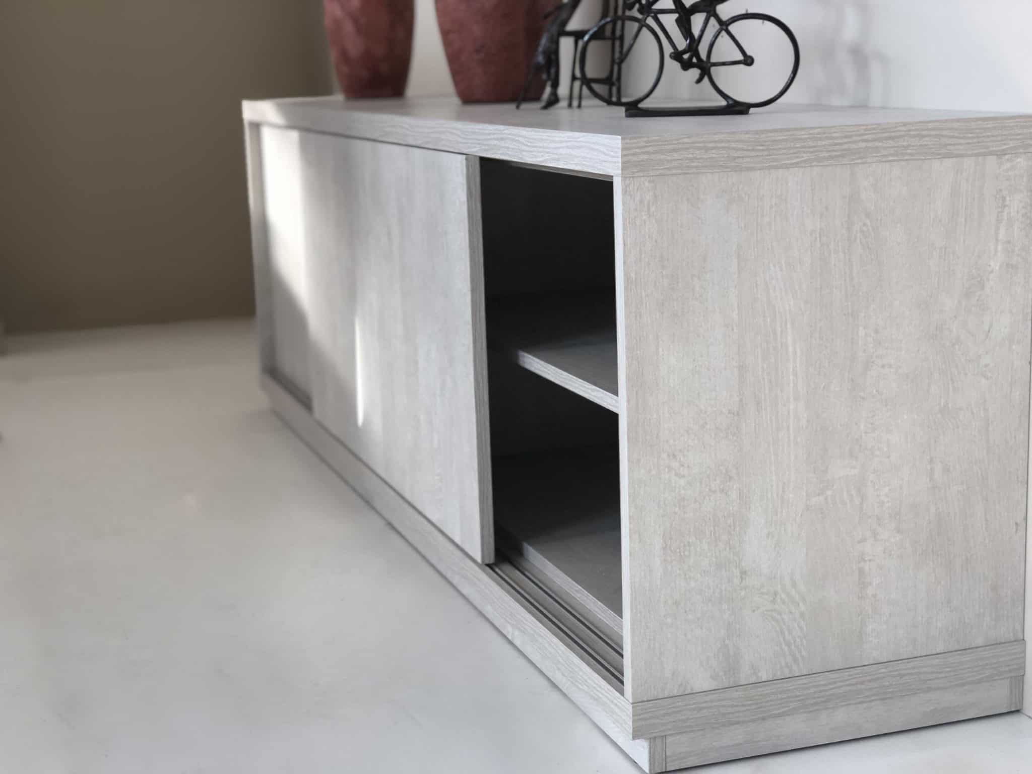 Como solución podemos colocar puertas correderas también en los muebles de salón que no sean un obstáculo para la silla y nos hagan más fácil el acceso al interior del mueble.