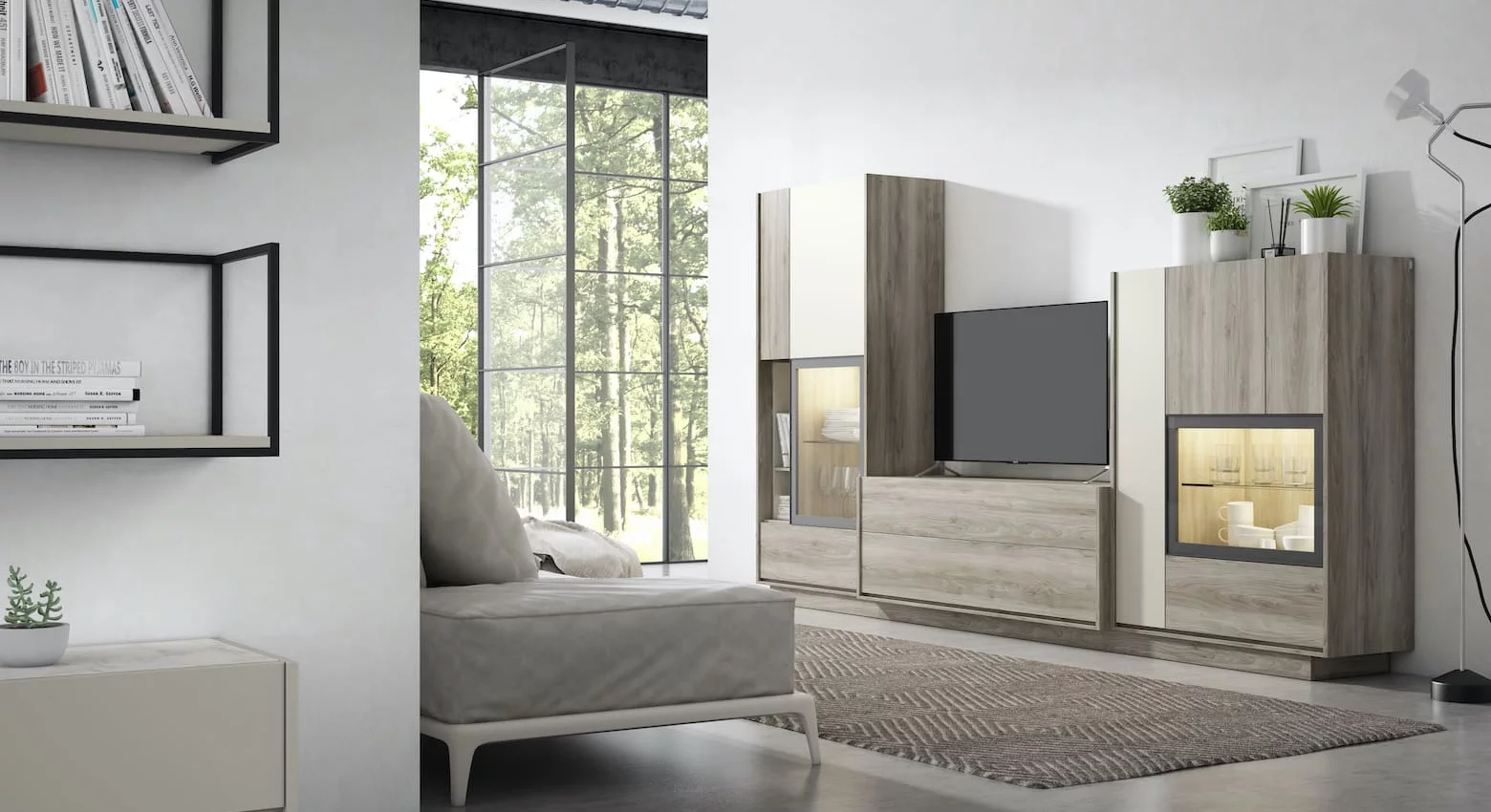 Como siempre en nuestros muebles a medida podrás añadir complementos como leds, estantes de cristal, vitrinas en cristal transparente, glaseado o lacado, paneles de televisión, etc, y así acabar de personalizarlo.